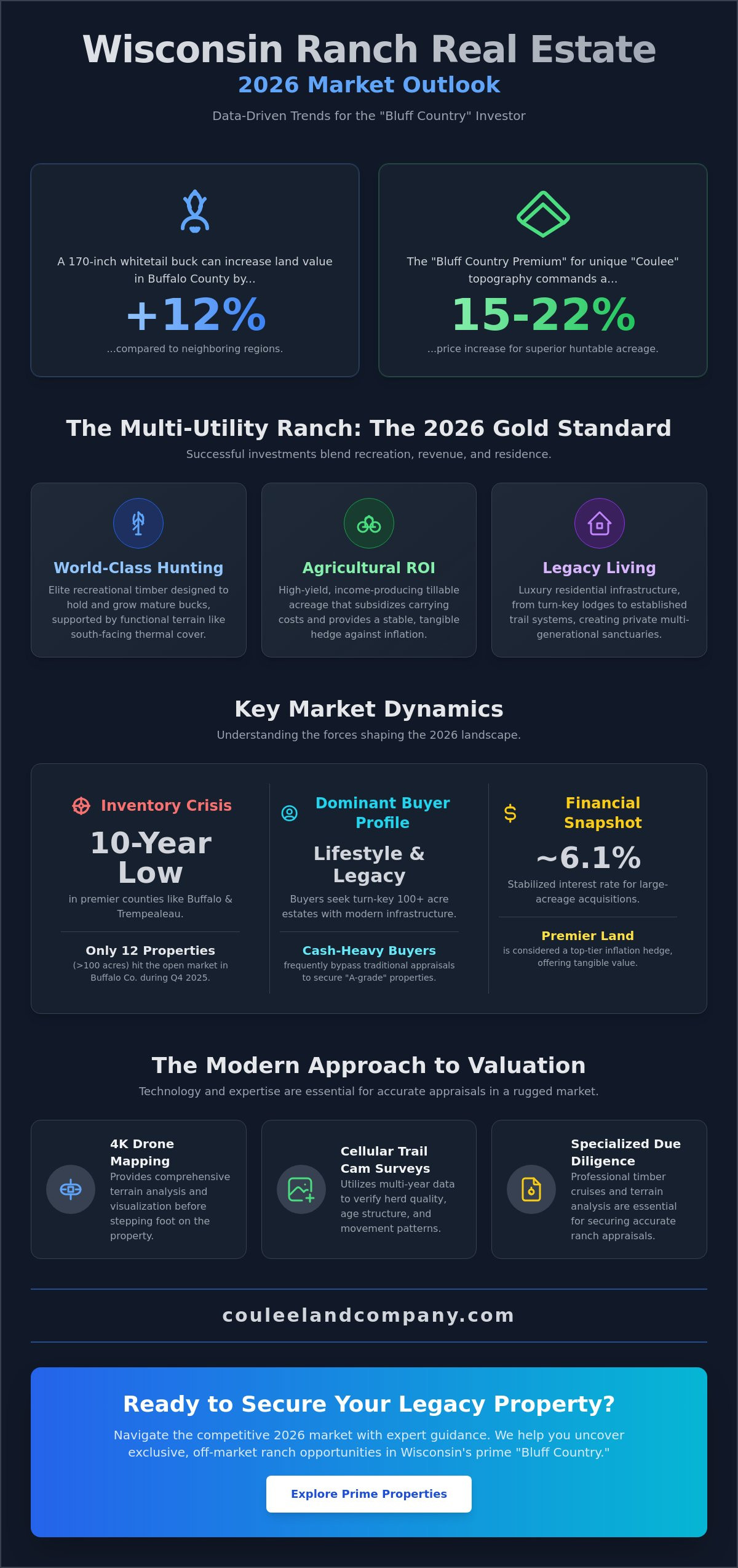 The 2026 landscape demands a blend of grit and data. We’ve seen how multi-utility properties are driving the market, where a ranch isn’t just land; it’s a strategic asset for both recreation and long-term legacy. Navigating the 2026 Real Estate Trends for WI Ranches: Data-Driven Advice from Top Agents is the difference between a missed opportunity and owning a piece of Buffalo County history. Coulee Land Company has facilitated over $100M in Wisconsin land sales, focusing on the specialized needs of the modern outdoorsman. We specialize in the same Buffalo County trophy whitetail ground that consistently leads the Boone and Crockett Record Book. Our expertise is backed by the industry’s best, including endorsements from outdoor television professionals who trust our boots-on-the-ground knowledge. You’re not just buying acreage; you’re securing a future in Western Wisconsin’s premier territory. The data shows that high-quality hunting ground remains the gold standard for 2026. Find Your Wisconsin Legacy Ranch Today. Your legacy is waiting in the bluffs. Let’s go get it.