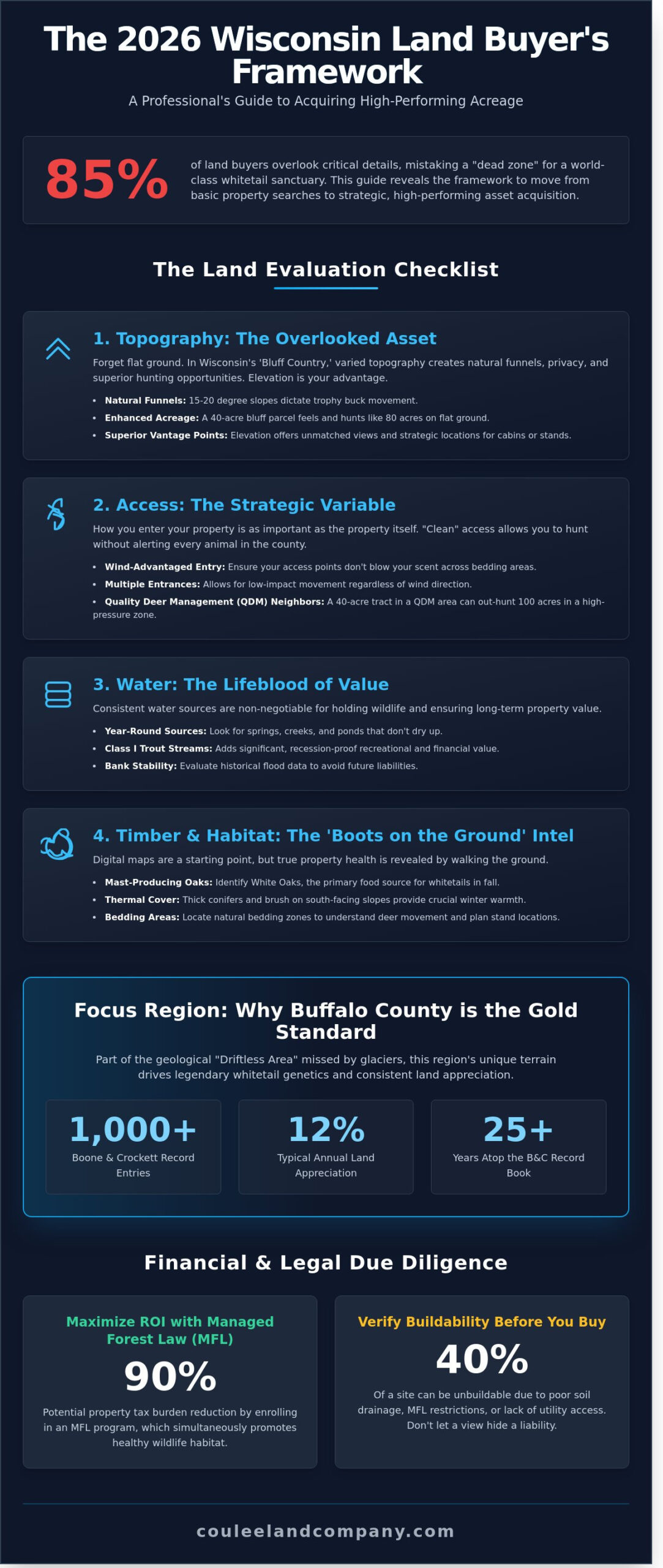 This 2026 guide delivers the exact framework we use at Coulee Land Company to help you secure superior tracts in the famed “Bluff Country” that offer both 12% annual appreciation and “trophy” hunting potential. You’ll learn how to navigate complex property tax programs, verify buildability on rugged terrain, and identify the specific habitat features that have kept Buffalo County at the top of the Boone and Crockett Record Book for over 25 years. We’re moving from basic property searches to professional land acquisition strategies that ensure your next purchase is a high-performing asset.