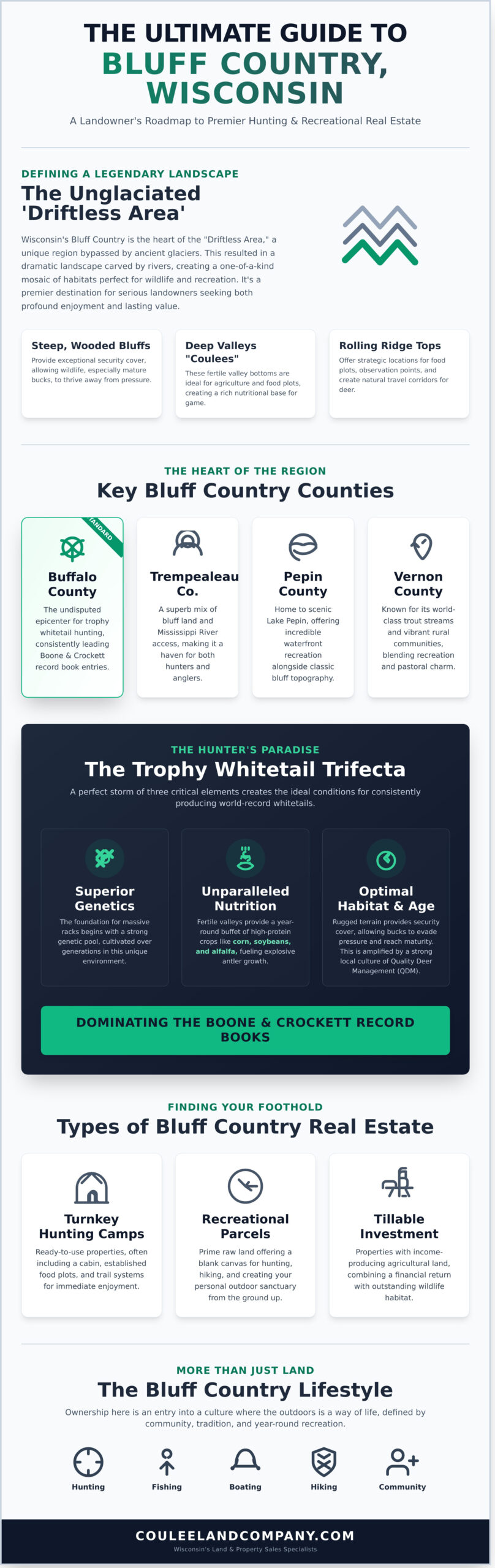 For the serious landowner and dedicated outdoorsman, the name “Bluff Country” evokes powerful images of mist-filled coulees, majestic ridges, and the pursuit of world-class trophy whitetails. Yet, this legendary region of Western Wisconsin can feel as mysterious as it is alluring. You might be asking: Where exactly does it begin and end? What truly sets this terrain apart for hunting and wildlife? And most importantly, how do you find a property that matches your vision and a realtor who understands the intricate value of a superior hunting tract? The search for premier bluff country wisconsin real estate can be overwhelming, but it doesn’t have to be.