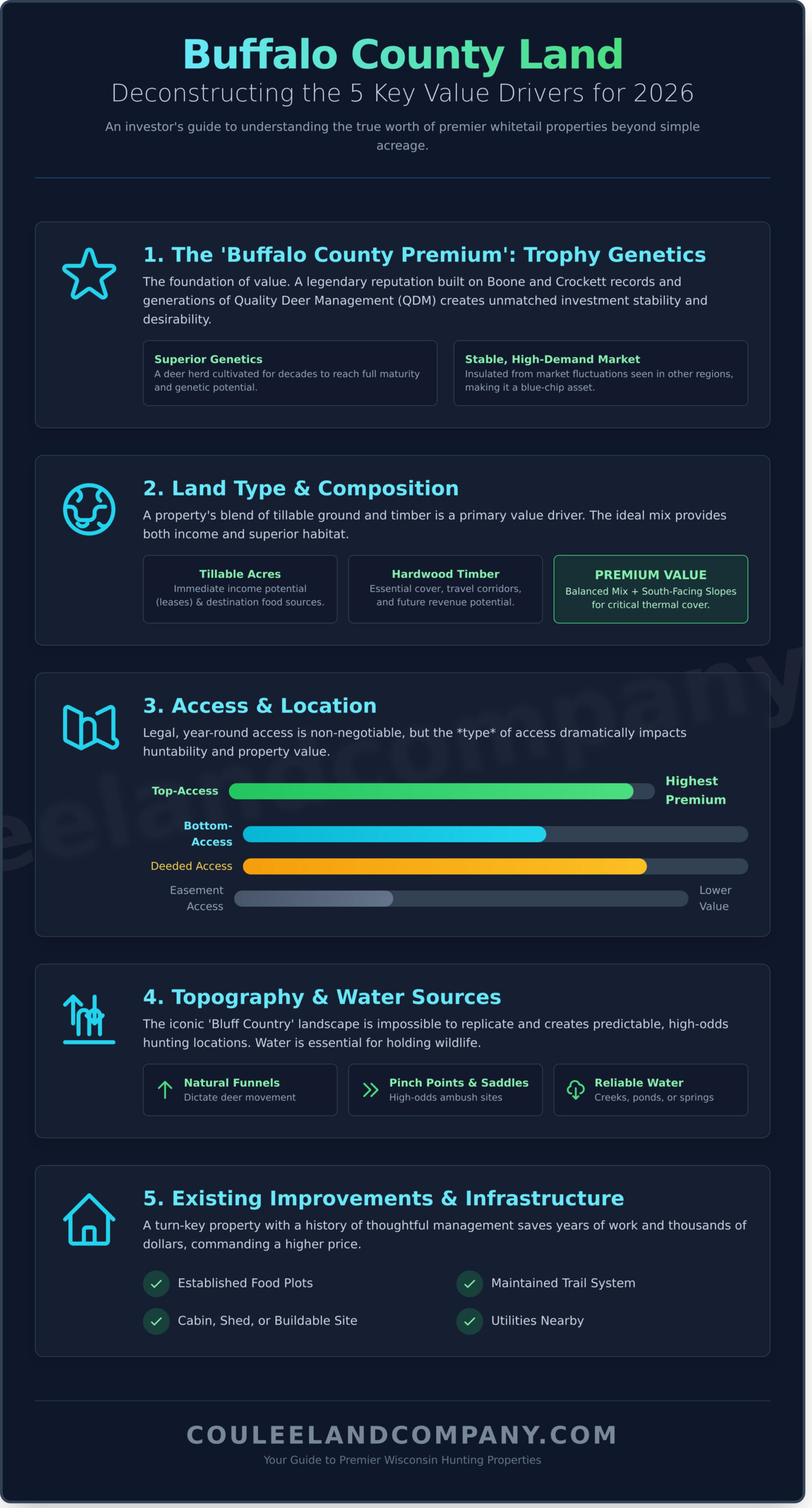 When evaluating hunting land, seasoned buyers know that total acreage is only the beginning of the story. The true value of a property is found in its composition and capabilities. Two 80-acre parcels can have vastly different price tags based on a handful of critical factors. Understanding these elements is the key to accurately assessing buffalo county land prices and identifying a property with superior potential.