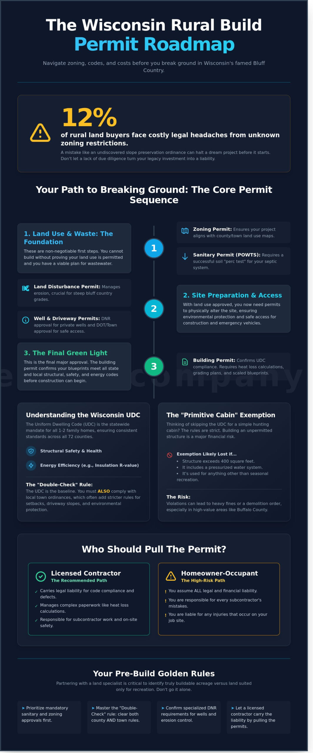 Last October, a buyer in Trempealeau County discovered that his dream ridge-top site was restricted by a 50 foot slope preservation ordinance he didn’t know existed. It’s a costly mistake that turns a legacy investment into a legal headache. Securing the correct building a home in rural wisconsin permits requires more than just a handshake at the local town hall. It demands an expert understanding of how Wisconsin’s unique topography and regulatory layers interact before you ever break ground. This scenario happens to approximately 12% of buyers who fail to verify zoning before closing.