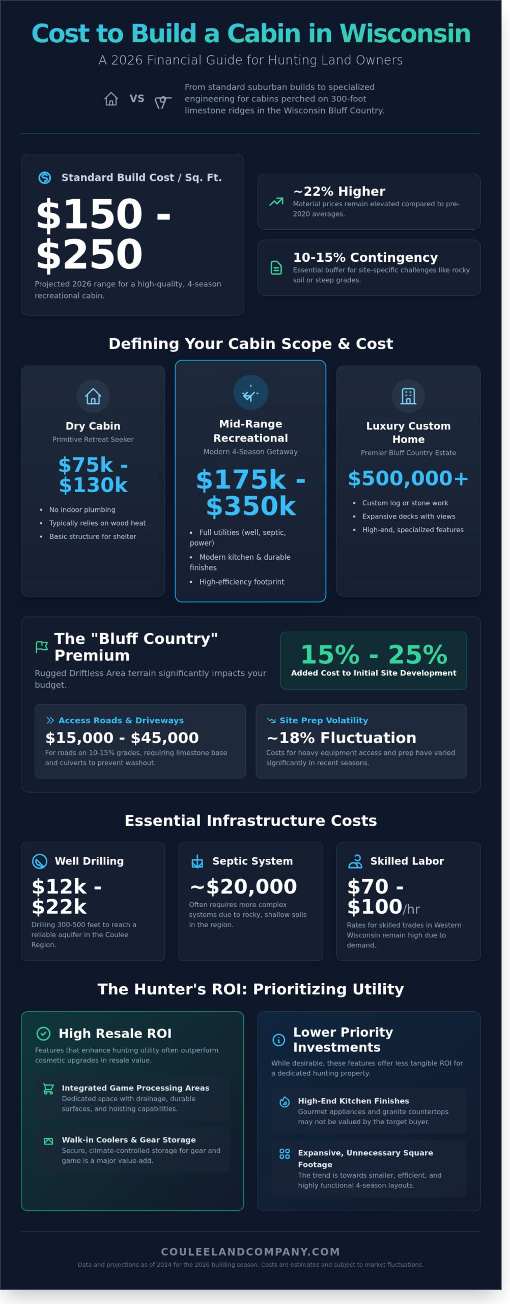 A standard suburban home build bears little resemblance to the specialized engineering required to perch a cabin atop a 300 foot limestone ridge in the Wisconsin Bluff Country. While the dream of a legacy hunting property is timeless, the financial reality of breaking ground has evolved significantly. You likely understand that securing a prime piece of the Driftless Area is only the first step, yet the logistics of rural construction in 2026 can feel like a moving target. We’ve seen site preparation costs on hilly terrain fluctuate by as much as 18% over the last two seasons alone. This guide provides a definitive breakdown of the cost to build a cabin in wisconsin 2026, ensuring your budget is as rugged as the land itself.