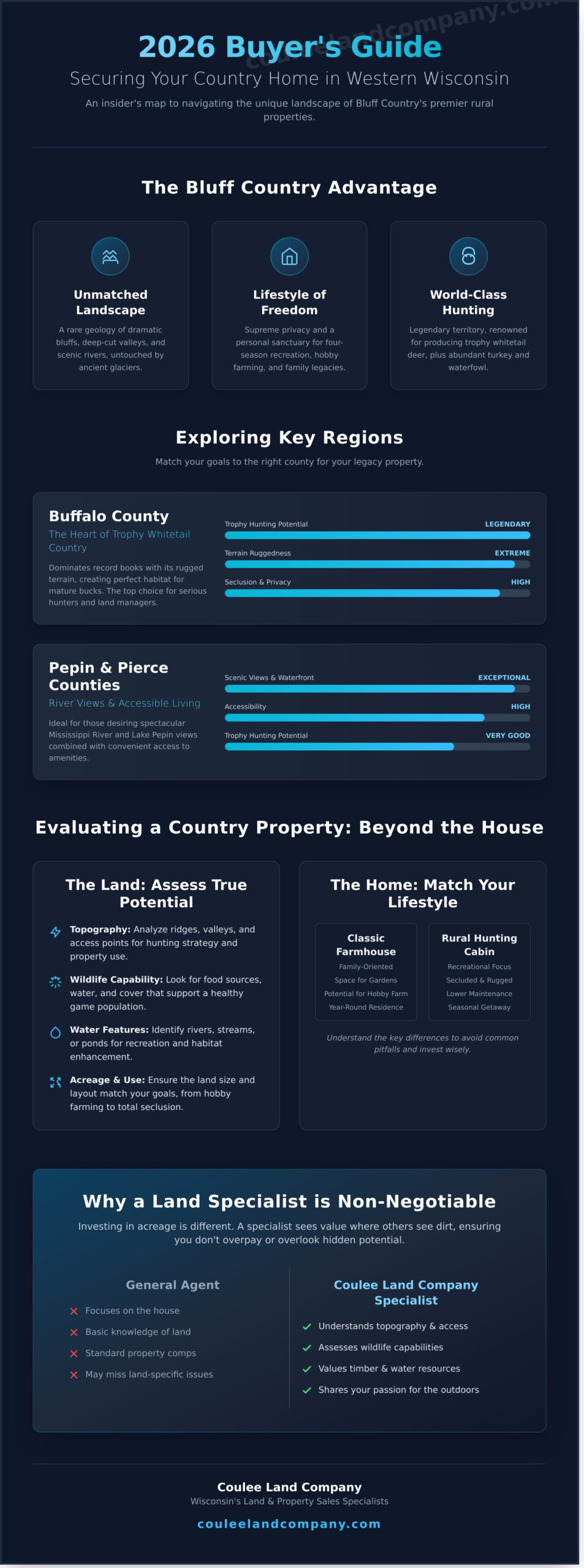 That’s precisely why we created this 2026 Buyer’s Guide. As Coulee Land Company, Wisconsin’s Land & Property Sales Specialists, we’ll equip you with the insider knowledge to navigate this unique market with confidence. You’ll discover the distinct advantages of legendary counties like Buffalo and Trempealeau, learn what to look for in a classic farmhouse versus a rural hunting cabin, and understand how to partner with a team that shares your passion for the outdoors. This is your definitive map to securing your own piece of Wisconsin’s premier rural landscape.