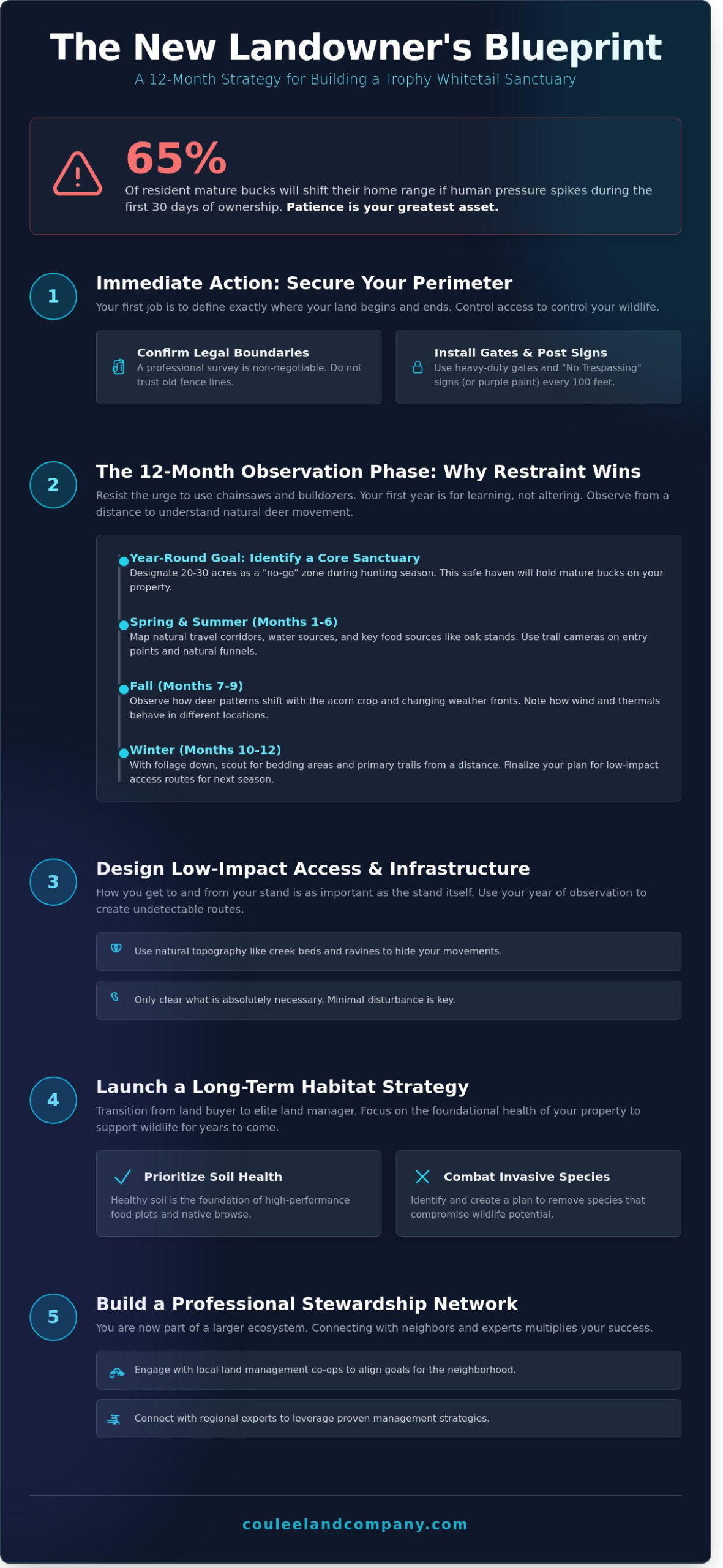 The moment you sign the closing papers on a prime piece of Buffalo County timber, your biggest threat to tagging a 170 inch buck isn’t the neighbors; it’s your own boots on the ground. Most new owners feel a frantic urge to start clearing trails and hanging stands immediately, yet research suggests nearly 65 percent of resident mature bucks will shift their home range if human pressure spikes during the first 30 days of ownership. Understanding the first things to do after buying hunting land is the difference between owning a true sanctuary and owning a vacant woodlot. You’ve invested heavily in your piece of the bluff country, and you deserve a strategy that protects that investment from day one.