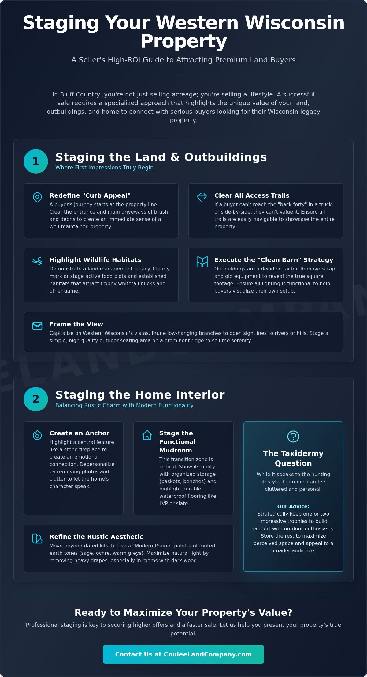 The mistake most sellers make in Western Wisconsin is assuming that a prime piece of Bluff Country real estate will sell itself based on acreage alone. While your property might sit in a county that dominates the Boone and Crockett record books, buyers need to see more than just a map; they need to see a lifestyle. Learning how to stage a country home for sale requires a specialized approach that goes beyond fresh paint. You’ve likely felt the frustration of trying to explain the value of a 2,400 square foot pole shed or felt concerned that your cozy, lived-in interior feels a bit too rustic for someone relocating from the city.