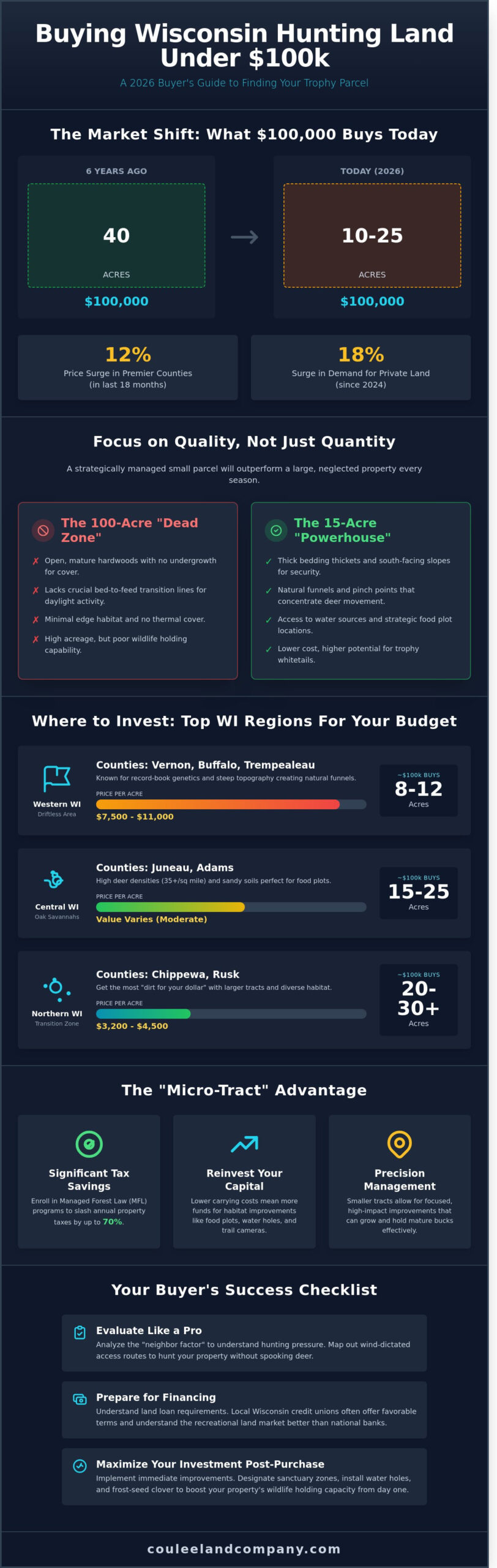 We understand that the fear of buying a “dead” parcel with zero deer activity is what keeps many hunters on the sidelines. At Coulee Land Company, we’re specialists who believe that a well managed 15 acre tract can outproduce a neglected 100 acre farm every single season. This 2026 guide will help you identify four specific counties where your $100,000 budget still holds maximum buying power and teach you three land management strategies needed to grow and hold mature whitetails on limited acreage. We’re moving beyond the broad listings to show you how to evaluate soil quality, bedding cover, and neighborhood pressure so you can secure your legacy before the next price hike.