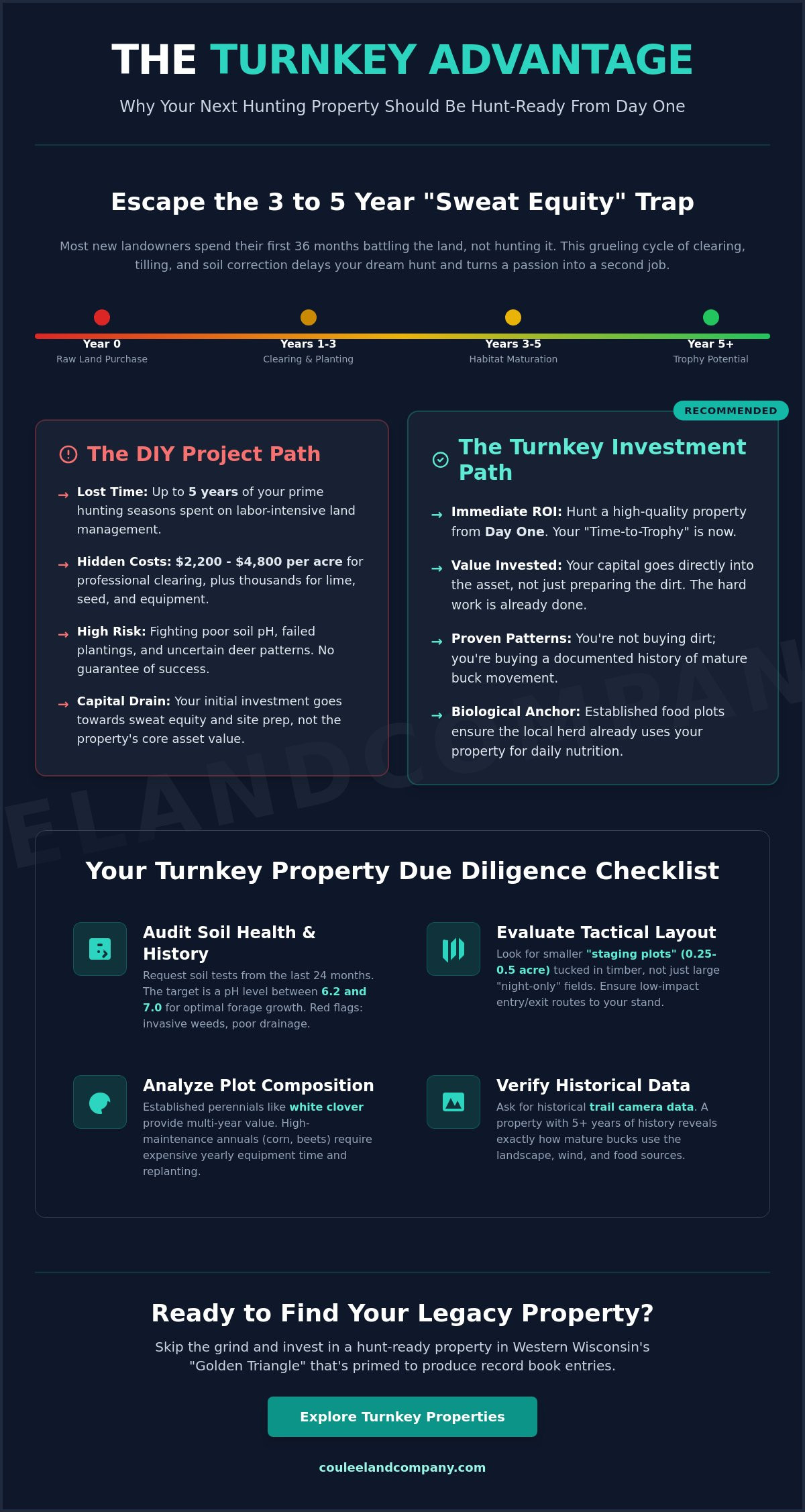 We agree that your time is better spent glassing the ridges of Western Wisconsin than clearing brush. This guide reveals why turnkey land in the Coulee Region is the ultimate investment for serious whitetail hunters who demand an immediate return on their hunting quality. We’ll examine the logistical benefits of established habitat and provide a roadmap for identifying properties in Buffalo County that are already programmed to produce Boone and Crockett record book entries.