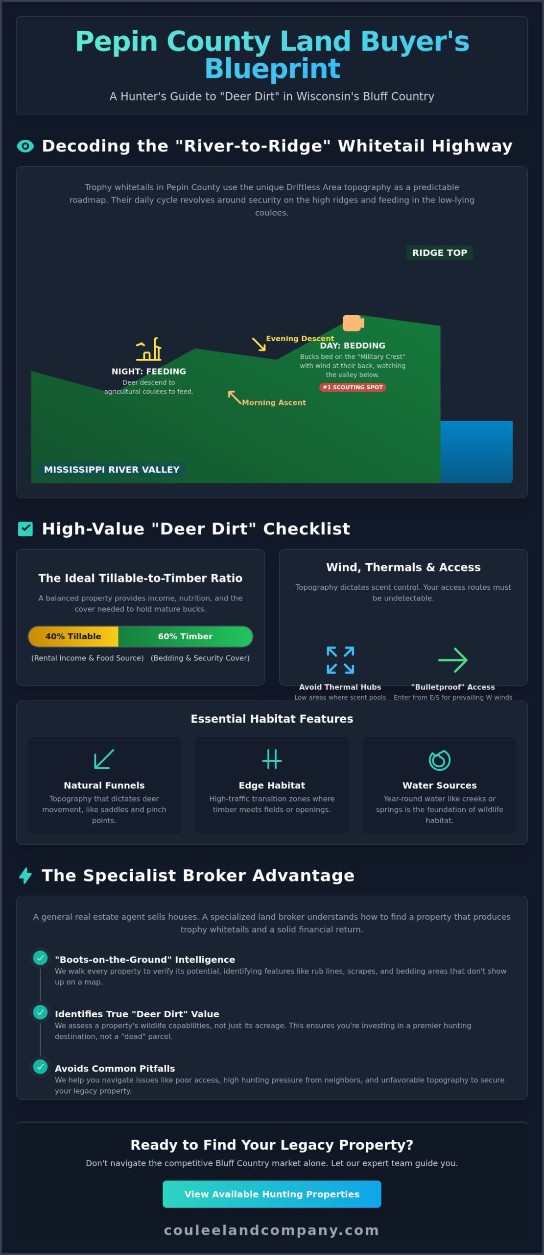 - Decode the unique “River-to-Ridge” topography where the Mississippi meets the bluffs to predict trophy whitetail movement with precision.