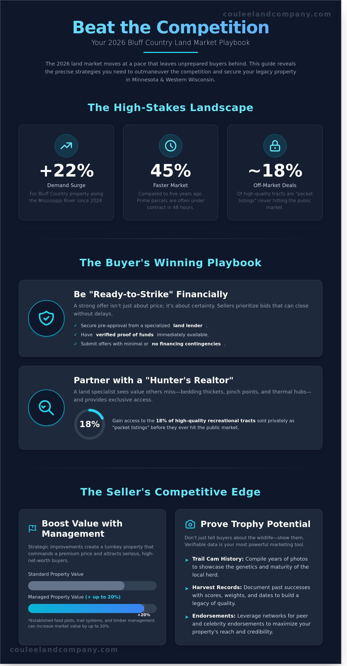 The 2026 land market in Bluff Country is moving at a pace that leaves unprepared buyers in the dust. If you want to secure a legacy property this year, you must understand that MN: Beat the Competition is a tactical necessity rather than a simple suggestion. You’ve likely experienced the frustration of losing a prime Buffalo County listing within 24 hours because a generic agent didn’t recognize the value of a specific bedding thicket or thermal hub. It’s exhausting to watch high-quality hunting land disappear while you’re still trying to determine if the price reflects the actual wildlife capabilities of the soil.