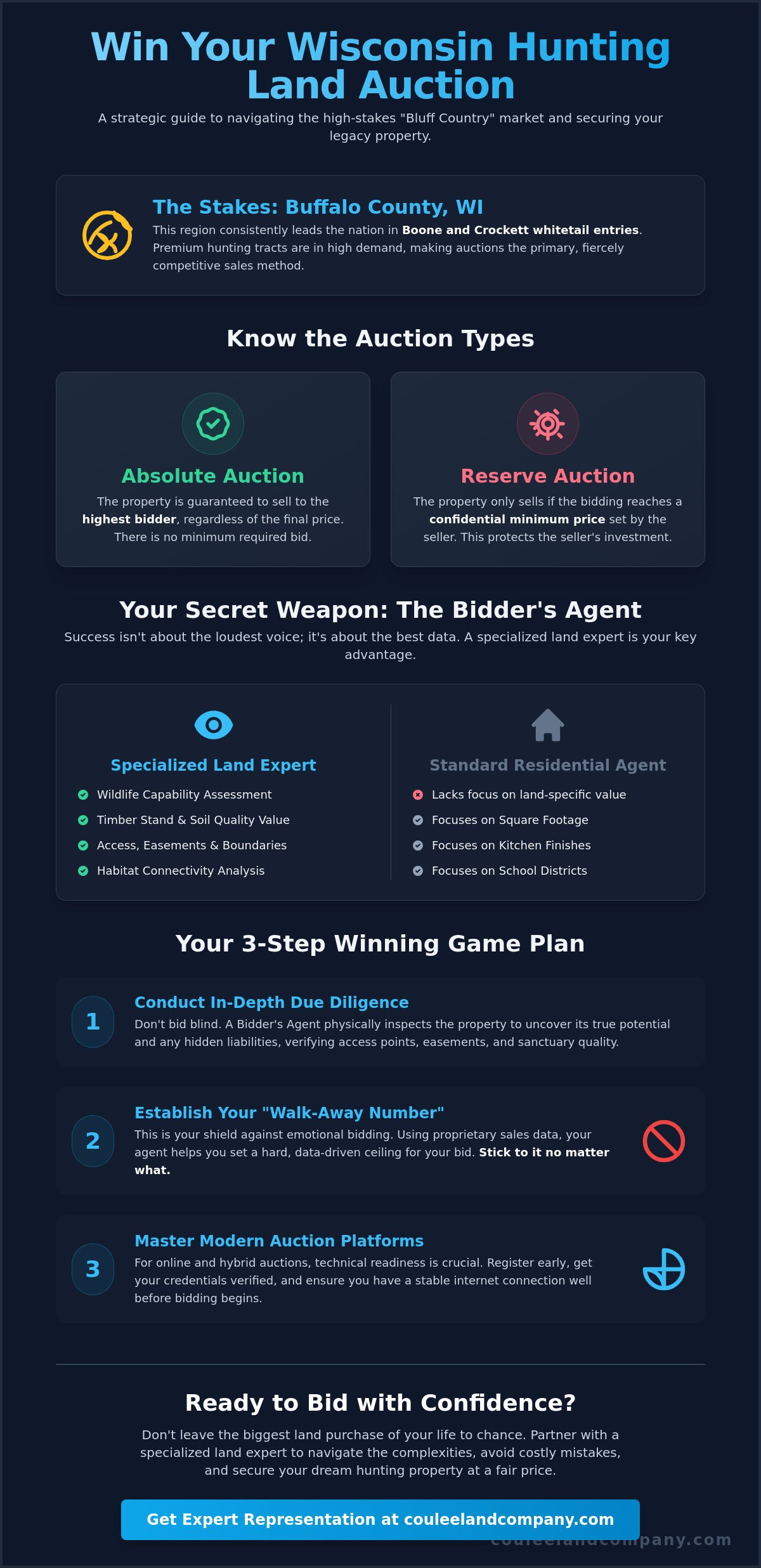 - Learn why Preparing for Land Auctions in WI: Tips to Win with Expert Representation is the key to identifying the hidden wildlife capabilities of premium Bluff Country tracts.