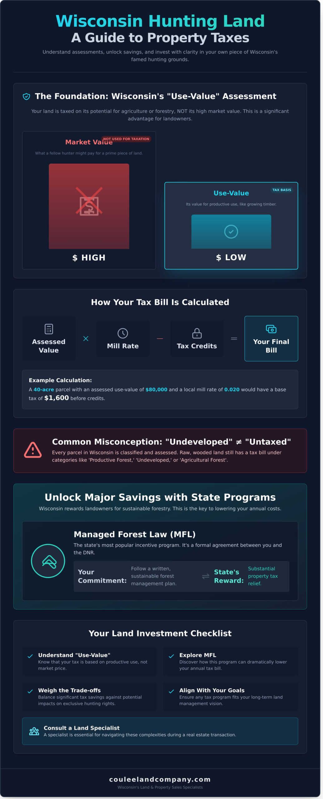 As Wisconsin’s Land & Property Sales Specialists, we believe that a sound investment starts with absolute clarity. This guide is designed to provide just that. We will break down exactly how your hunting property is assessed and, most importantly, detail the powerful tax-saving programs available to you, like Managed Forest Law (MFL). You will gain a confident understanding of the pros and cons, empowering you to lower your annual costs without sacrificing the control and privacy of your land. By the end, you’ll have the knowledge to manage your tax burden effectively or evaluate a new property with the sharp eye of an informed buyer.