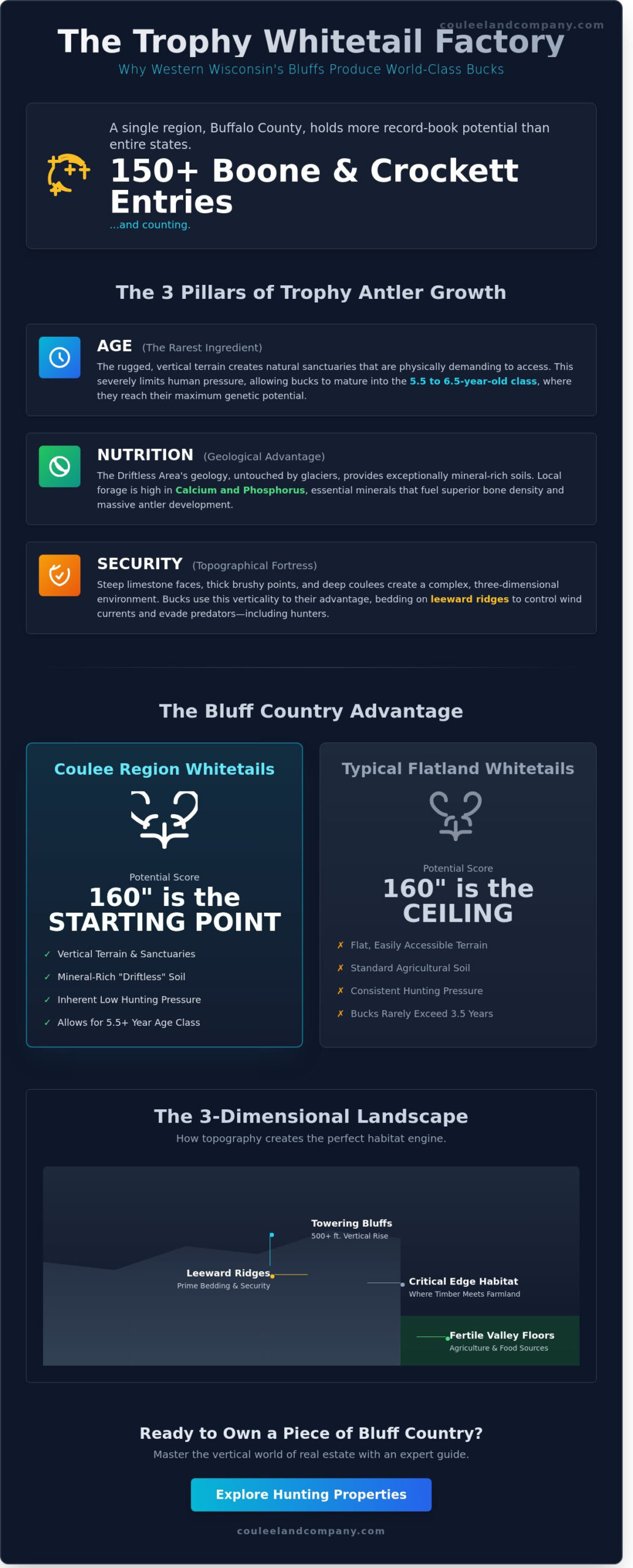 Western Wisconsin’s topography isn’t just a scenic backdrop; it’s a biological engine for antler growth. The Bluffs provide the three specific ingredients every trophy buck requires: age, nutrition, and security. In flatter agricultural regions, a 160-inch whitetail is often the ceiling. In the Coulee Region, that’s just the starting point for dedicated land managers who understand the land’s potential.