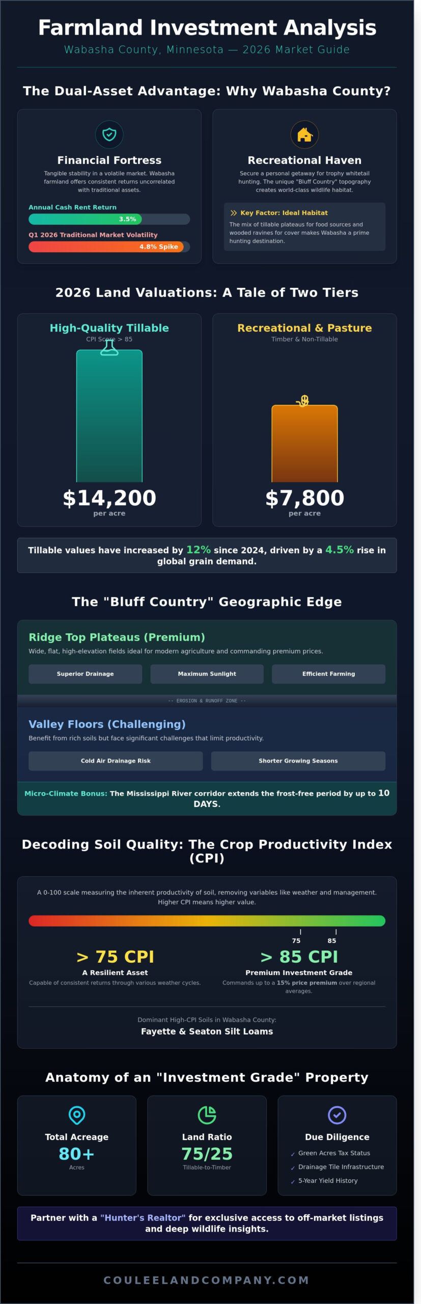 Investing in the driftless region requires more than just a map; it demands a deep understanding of 2026 market dynamics where high CPI soil meets world-class trophy whitetail habitat. This Guide to Tillable Farmland Investments in Wabasha County highlights why elite buyers prioritize properties that balance consistent commodity yields with superior wildlife capabilities. You’ve seen how modern 2026 regulations and 1031 Tax-Deferred Exchange strategies now shape the local landscape. Coulee Land Company has closed over $500M in regional land sales by focusing on these precise data points. Our specialists are endorsed by top outdoor television hosts because we don’t just sell acreage; we secure legacy assets. Whether you’re navigating updated environmental codes or seeking a dual-income property, expert guidance ensures your capital works as hard as the soil itself. You deserve a partner who knows every bluff and bottom in this territory.