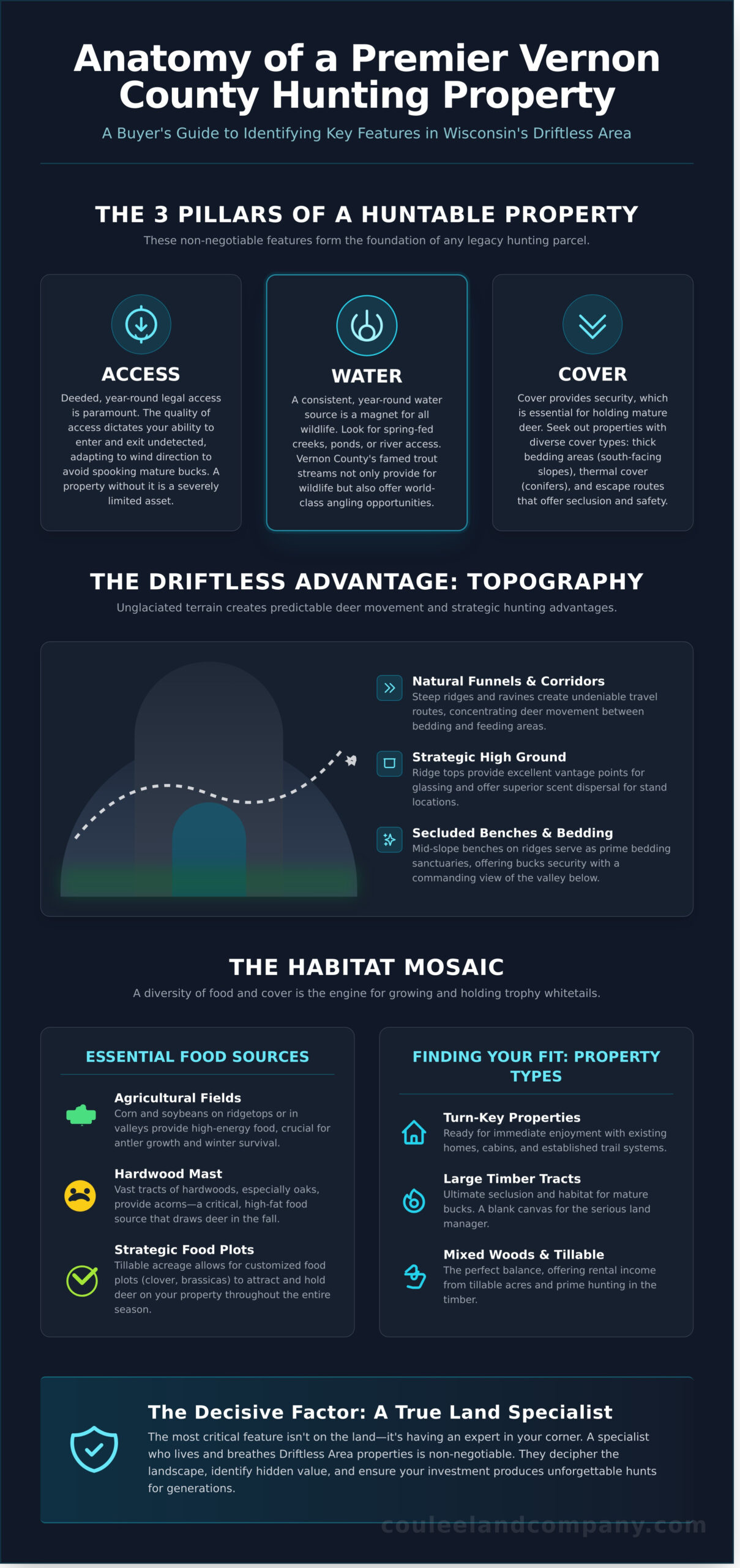 When you begin your search for vernon county wi hunting land for sale, it’s crucial to look beyond the listing price and total acreage. The true value of a hunting property lies in its character, its wildlife-holding capabilities, and its potential as a sound, long-term investment. As Wisconsin’s Land & Property Sales Specialists, we’ve learned that understanding the nuances of the landscape is what separates a good property from a legacy property. This expert guide will help you identify the key features that define a premier hunting parcel in the heart of the Driftless Area.