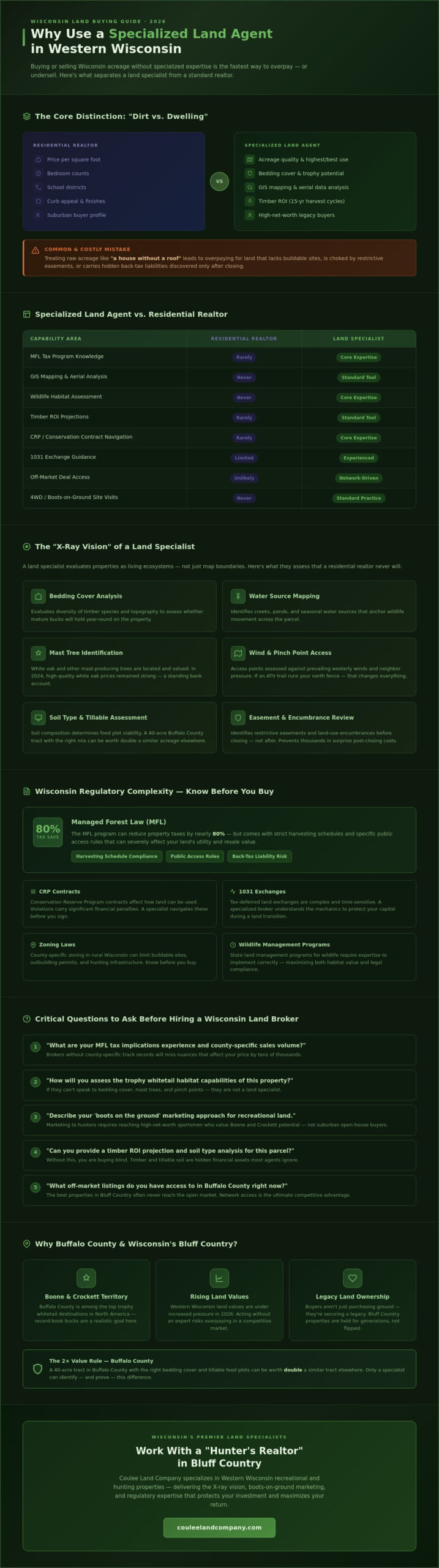 In the bluffs of Western Wisconsin, local expertise isn’t about a zip code on a business card. It’s about knowing how a 15-mph northwest wind affects a specific valley. Your agent should live the lifestyle they sell. When an agent manages their own timber and hunts the same ridges, they offer authentic insight that a city-based realtor cannot match. Look for agents endorsed by respected figures in the outdoor community to ensure they have the “hunter’s realtor” pedigree. This level of specialization is why use a specialized land agent when looking at high-value tracts in Buffalo County.