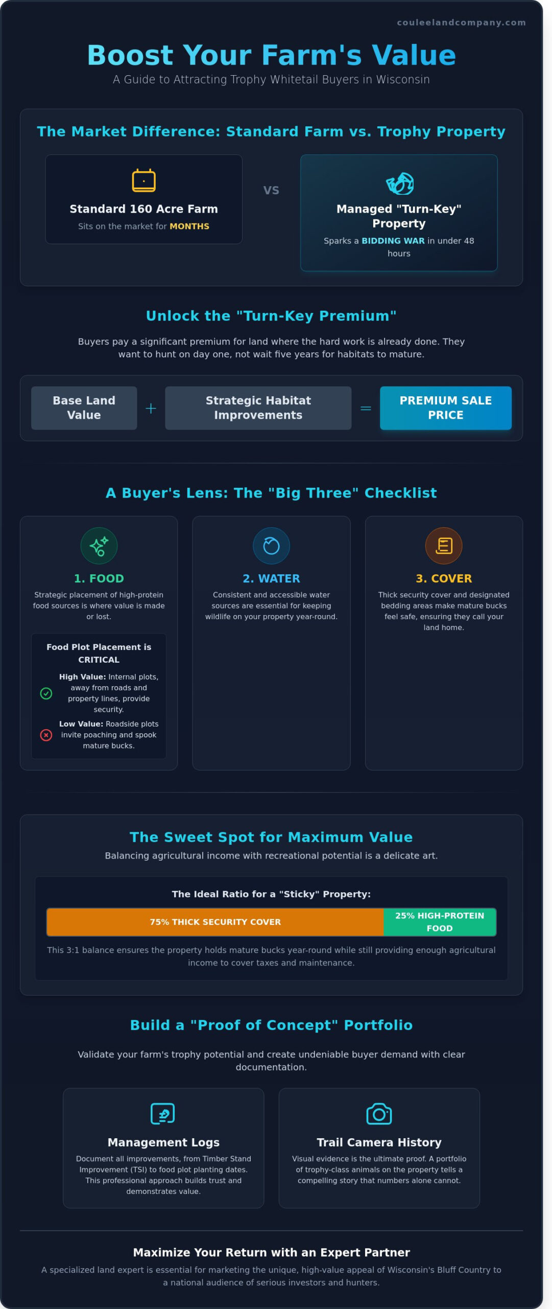 A standard 160 acre Wisconsin farm might sit on the market for months, but a property with a proven track record of 150 inch whitetails can spark a bidding war in under 48 hours. You likely understand that land is more than just soil and timber; it is a legacy and a sanctuary. Many sellers worry that investing in food plots or timber stand improvement won’t actually move the needle on their final sale price. You don’t want to over-improve your land only to see it languish next to a neighboring farm that is priced lower.