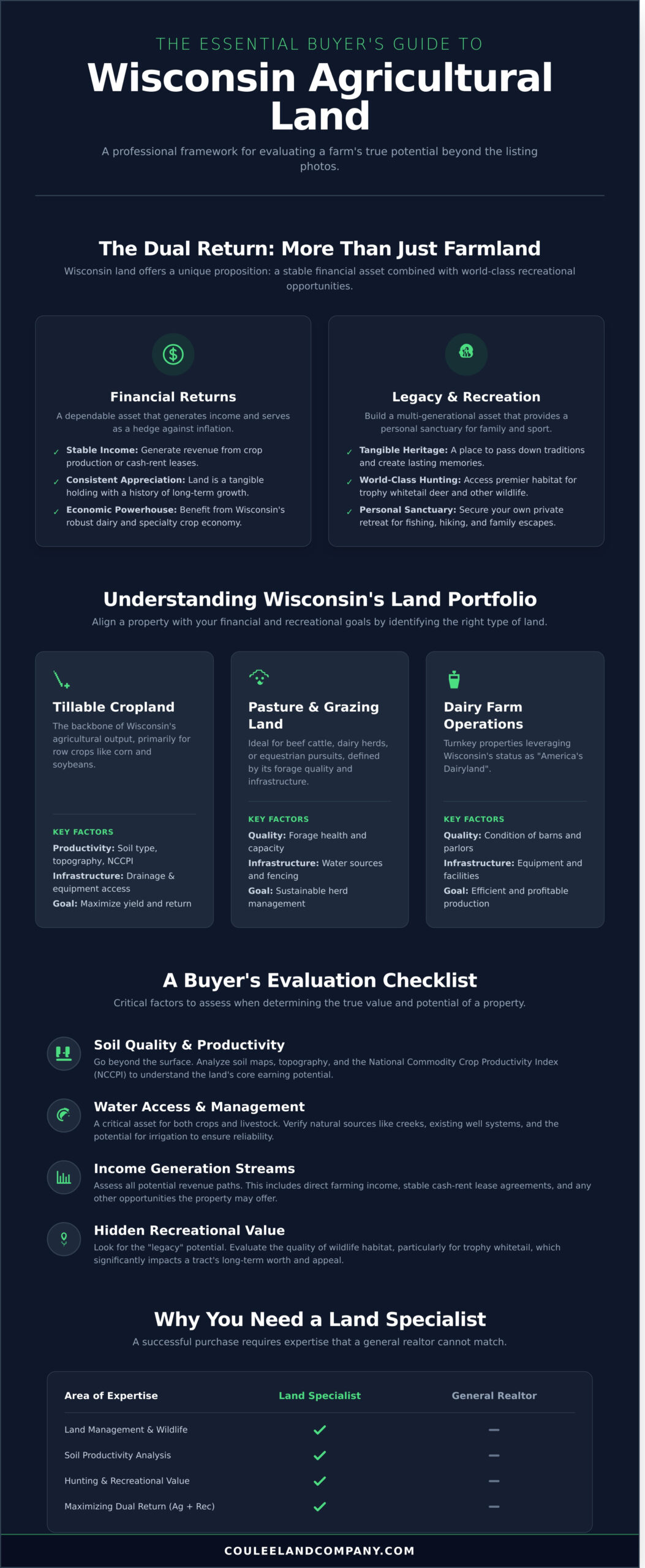 - Discover how the best Wisconsin agricultural land for sale offers a dual return on investment by combining farm income with premier habitat for trophy whitetail deer.